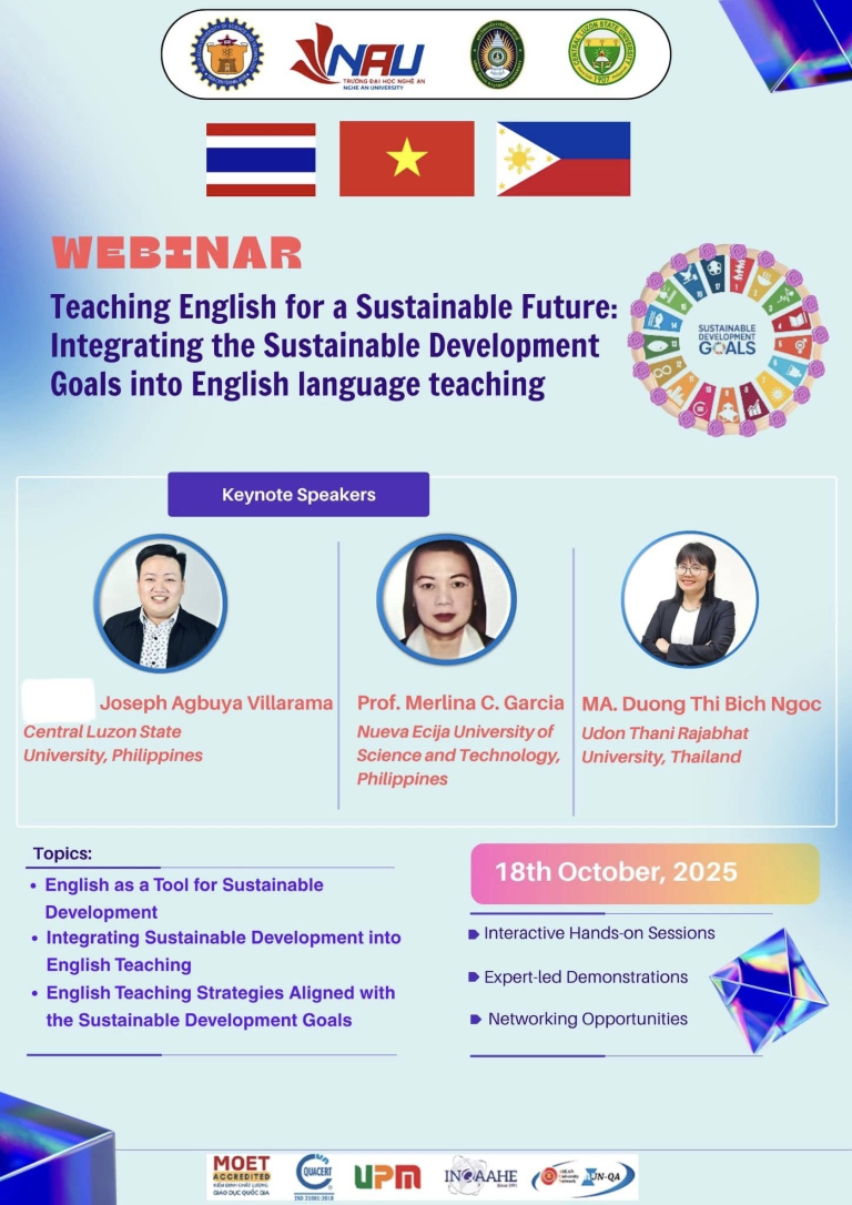 On October 18, 2025, Nghe An University (NAU), Vietnam successfully hosted an international webinar themed “Teaching English for a Sustainable Future: Integrating the Sustainable Development Goals into English Language Teaching.”
